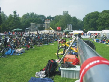 an der die Sportler Ihre Fahrräder in der Wechselzone aufhängen