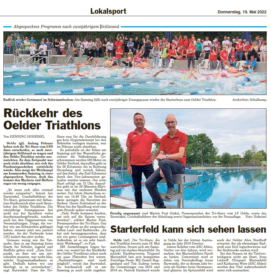 Als Ausrichter möchten wir uns vom LV Tristar Oelde herzlich bedanken bei allen Helfern, unseren Sponsoren, dem THW, dem DRK, der SG Oelde, dem LV Oelde, dem Forum & Stadt Oelde, der Polizei, und allen Streckenposten, ohne die der Oelder Triathlon so nicht möglich gewesen wäre.